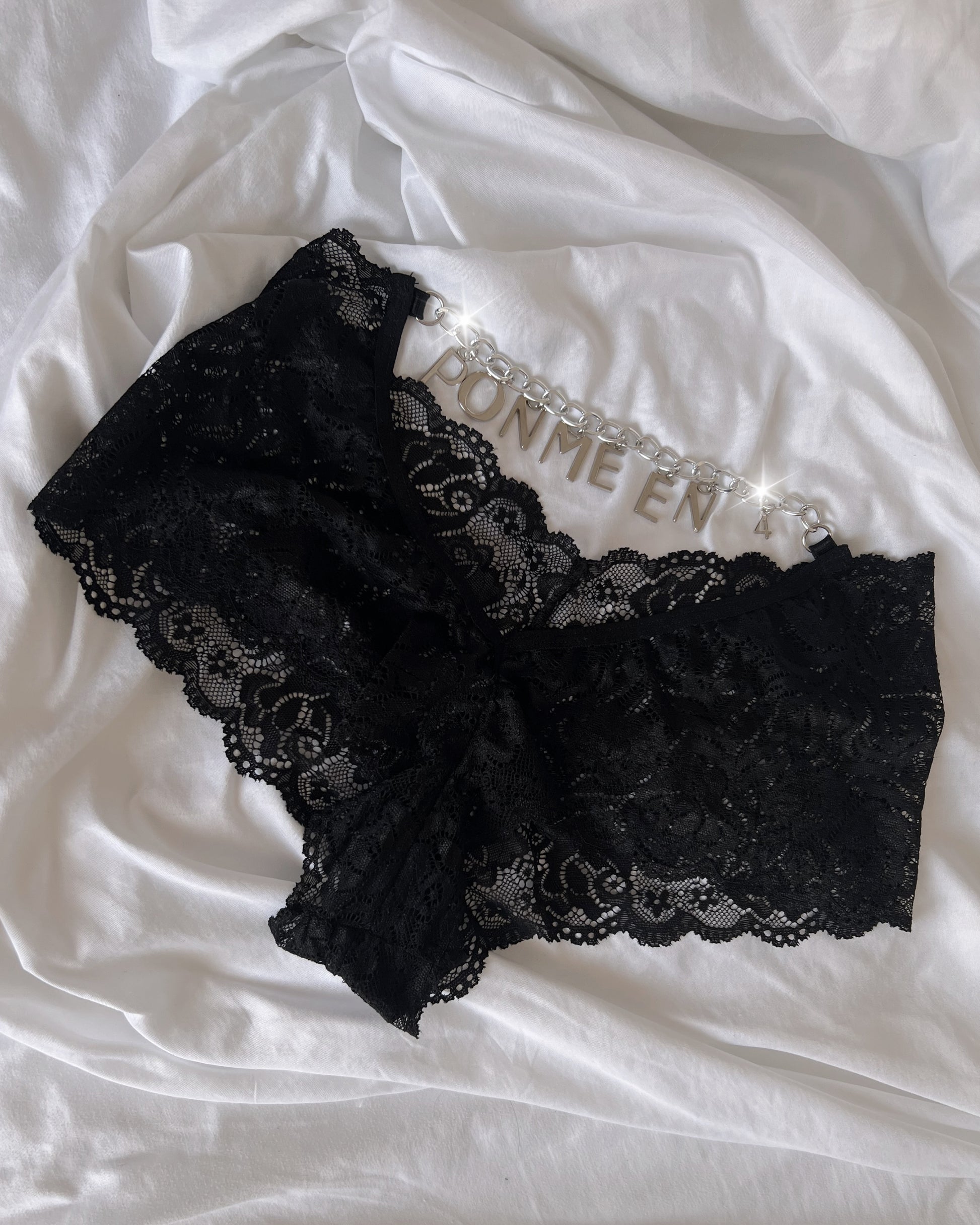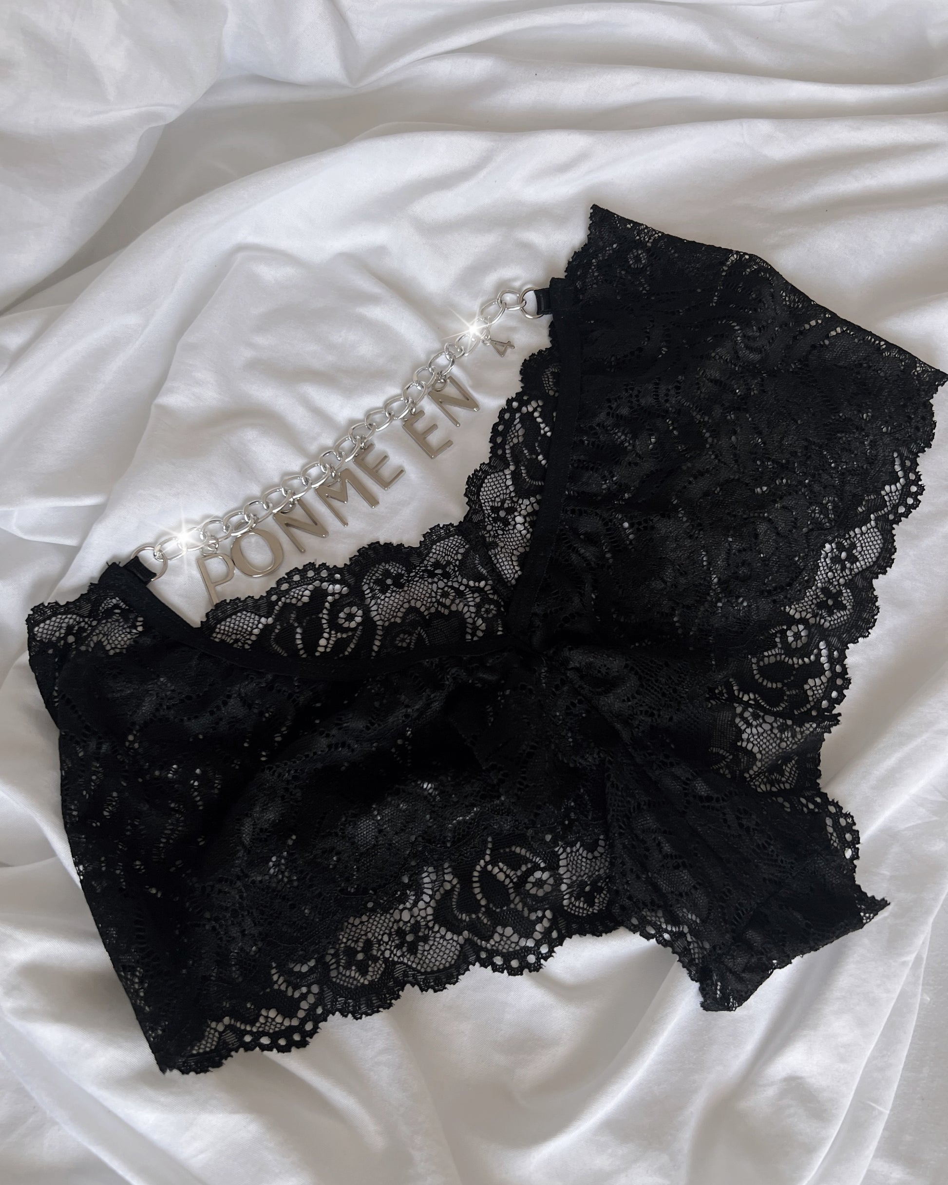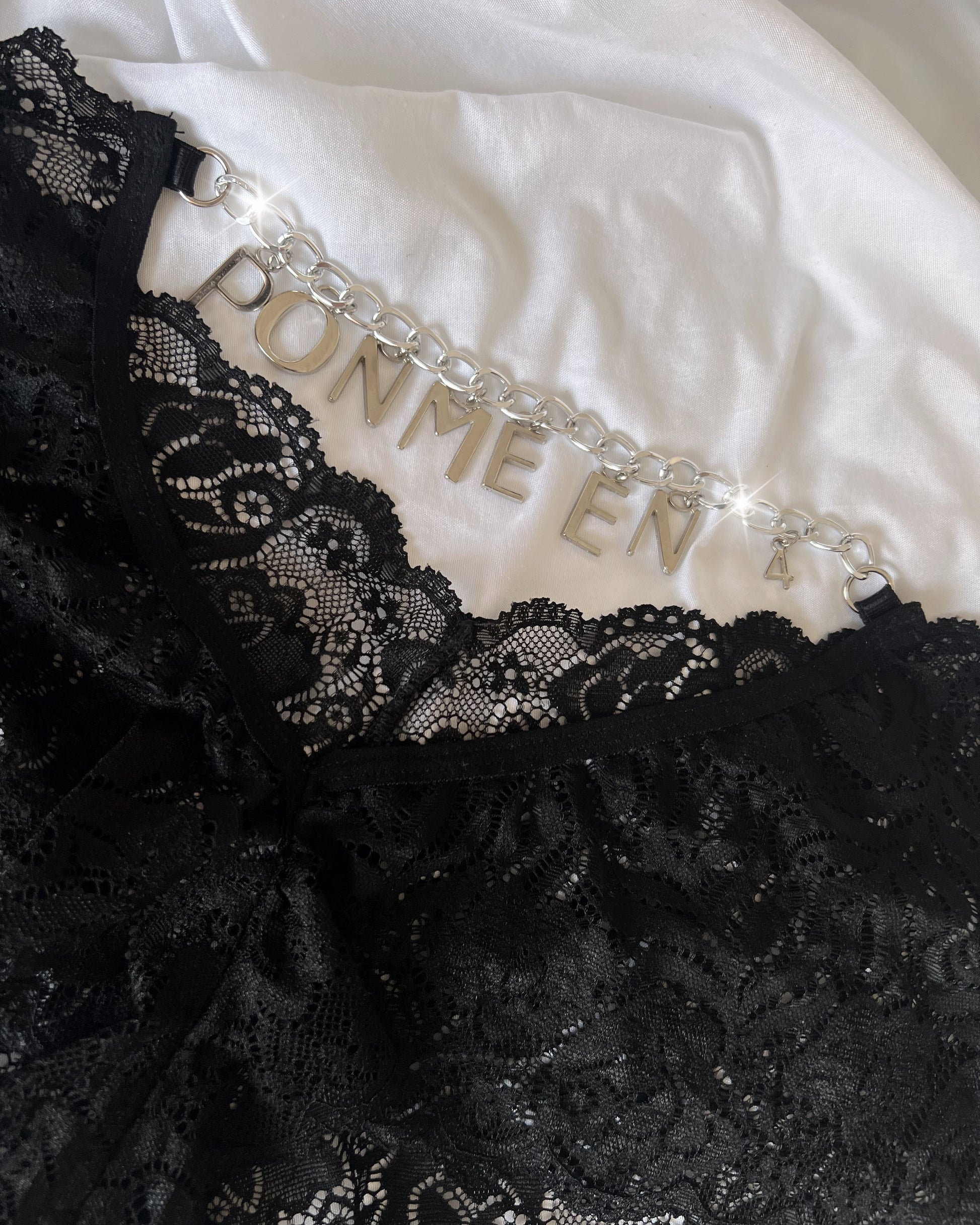 Cachetero en encaje elástico personalizable, con detalle de cadena y dijes inoxidables en la parte trasera.